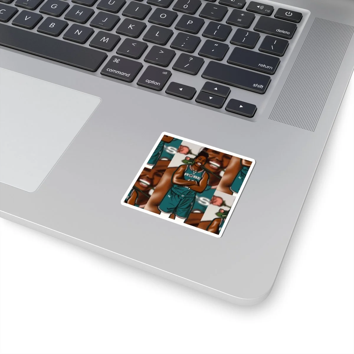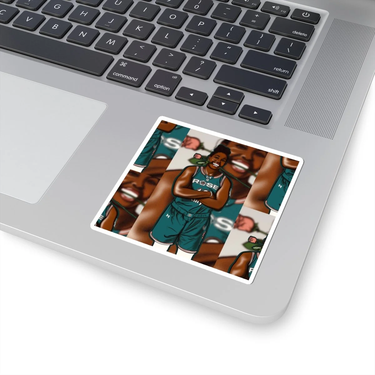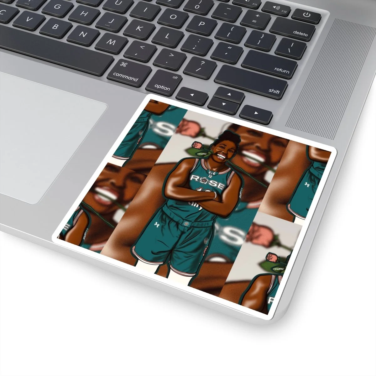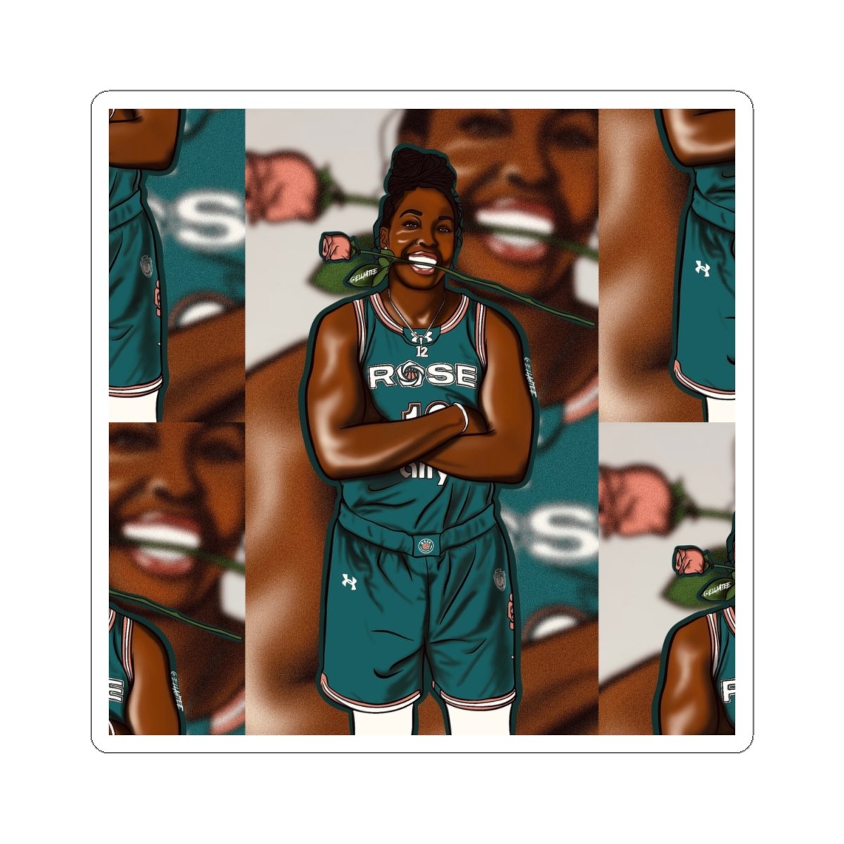 Bright, glossy kiss-cut stickers that bring a joyful, sporty energy to your laptop, journal, or water bottle. The design captures a smiling Chelsea Gray in her Unrivaled RoseBC uniform holding a rose—bold lines, rich skin tones, and pops of color that read beautifully at small scale. These vinyl stickers apply smoothly and stay put on flat, indoor surfaces, adding personality to daily gear without fuss. Choose white or transparent backing and from multiple sizes to fit your space. They’re printed with eco-solvent inks for vivid color and finished with a scratch-resistant glossy coat that keeps the artwork shining.
