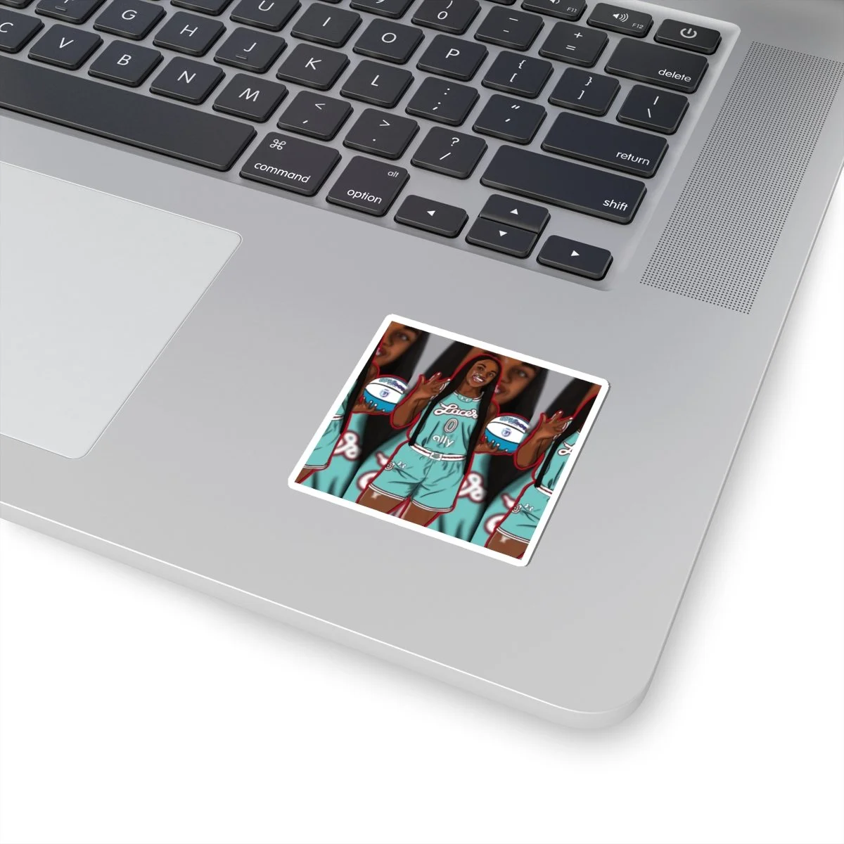 Bright, glossy kiss-cut stickers that celebrate basketball pride with bold, colorful illustration. The artwork features Jackie Young in her Unrivaled Laces uniform, repeated across a square layout that pops against laptops, journals, water-bottle sleeves, and painted surfaces. The glossy finish and vivid eco-solvent inks give the image depth and shine while the durable vinyl and strong acrylic adhesive keep the sticker firmly in place for long-lasting decoration. Choose white or transparent backing and from 3 different sizes to match your setup. These stickers are designed for adult collectors and fans who like clean application and eye-catching court-style flair.